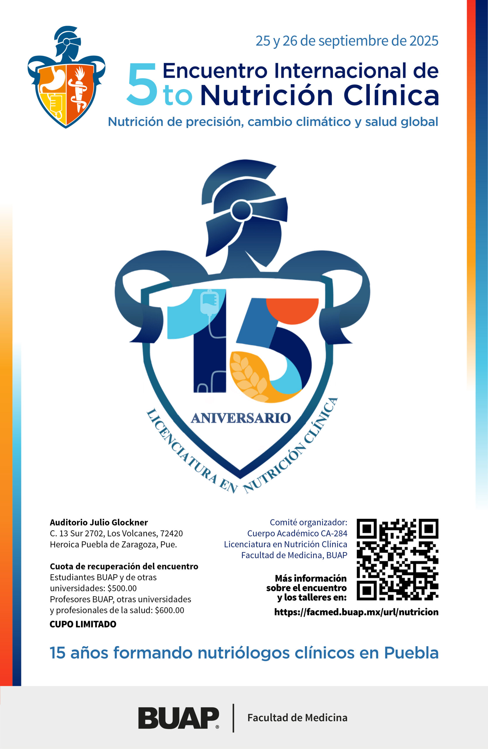 Volver al INICIO 🔬 5º Encuentro Internacional de Nutrición ClínicaNutrición de precisión, cambio climático y salud global: un reto actual 📅 Fechas: 25 y 26 de septiembre de 2025📍 Lugar: Auditorio "Julio Glockner" - Facultad de Medicina BUAP ✨ Conferencias magistrales con expertos nacionales e internacionales: Dra. Angélica León (Nutrición hospitalaria). Dra. Martha Kaufer (Políticas […]